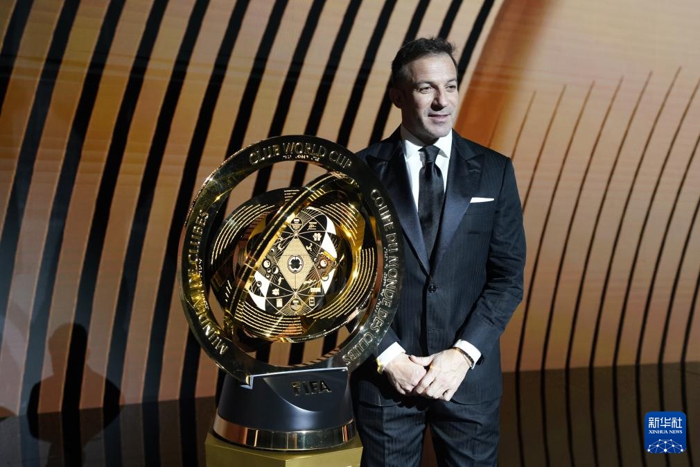 12月5日,意大利足球名宿皮耶羅在抽簽儀式上與世俱杯冠軍獎杯合影。