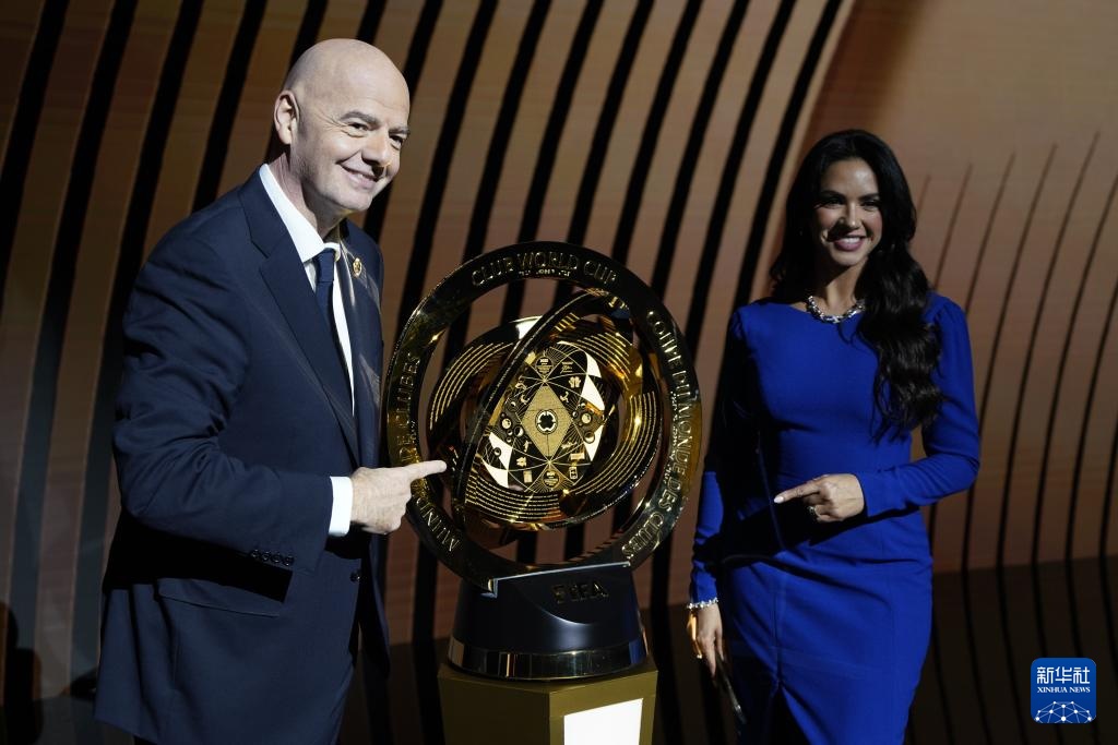 12月5日,國際足聯主席因凡蒂諾(左)在抽簽儀式上與世俱杯冠軍獎杯合影。