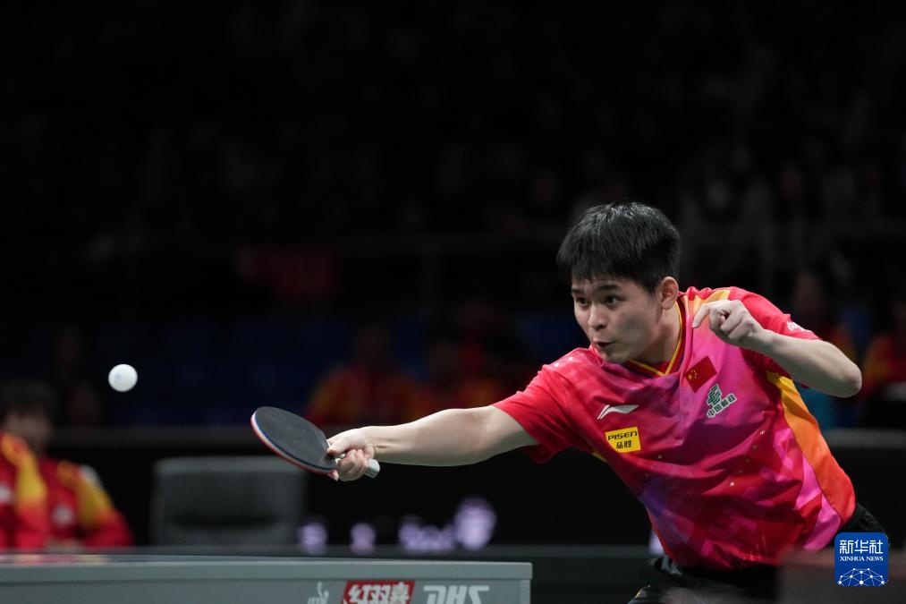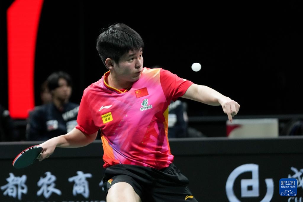 12月6日,中國隊選手林詩棟在男單比賽中回球。最終,他2比1戰勝日本隊選手田中佑汰。