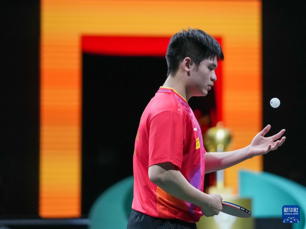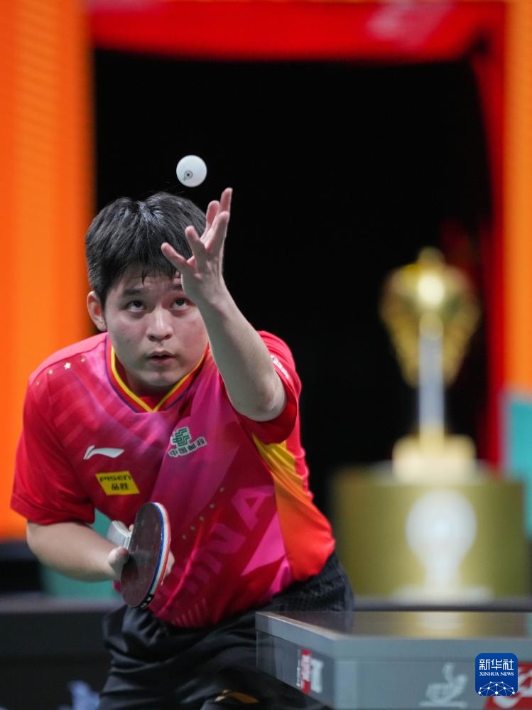 12月6日,中國隊選手林詩棟在男單比賽中發球。最終,他2比1戰勝日本隊選手田中佑汰。