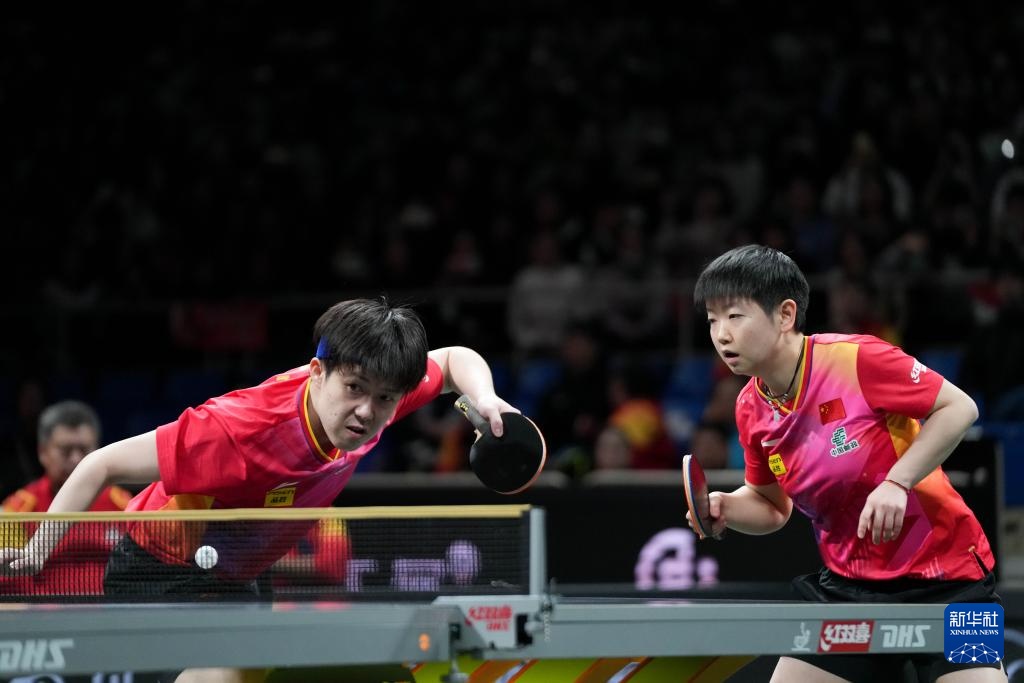 12月6日,中國隊組合王楚欽/孫穎莎(前)在混雙比賽中。最終,他們2比1戰勝日本隊組合川上流星/面手凜。