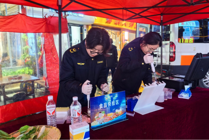 在抽檢工作現場,孝感、咸寧、恩施三地市場監管部門對前期點選排名靠前的海底撈、小龍坎等餐飲企業,以及廢柴、超級寬板凳老火鍋等特色餐飲企業開展了監督抽檢。對火鍋店營業執照、人員健康證、就餐環境逐一進行檢查,并重點檢查了火鍋店后廚環境衛生、原料控制與貯存、食品添加劑使用管理等方面情況。結合前期網絡點選和現場消費者點選,市場監管部門委托承檢機構對火鍋底料、牛肉、羊肉、豆腐、牛肉丸等常見食材以及南鄉蘿卜、元畈辣椒等本地特產食材進行抽樣。