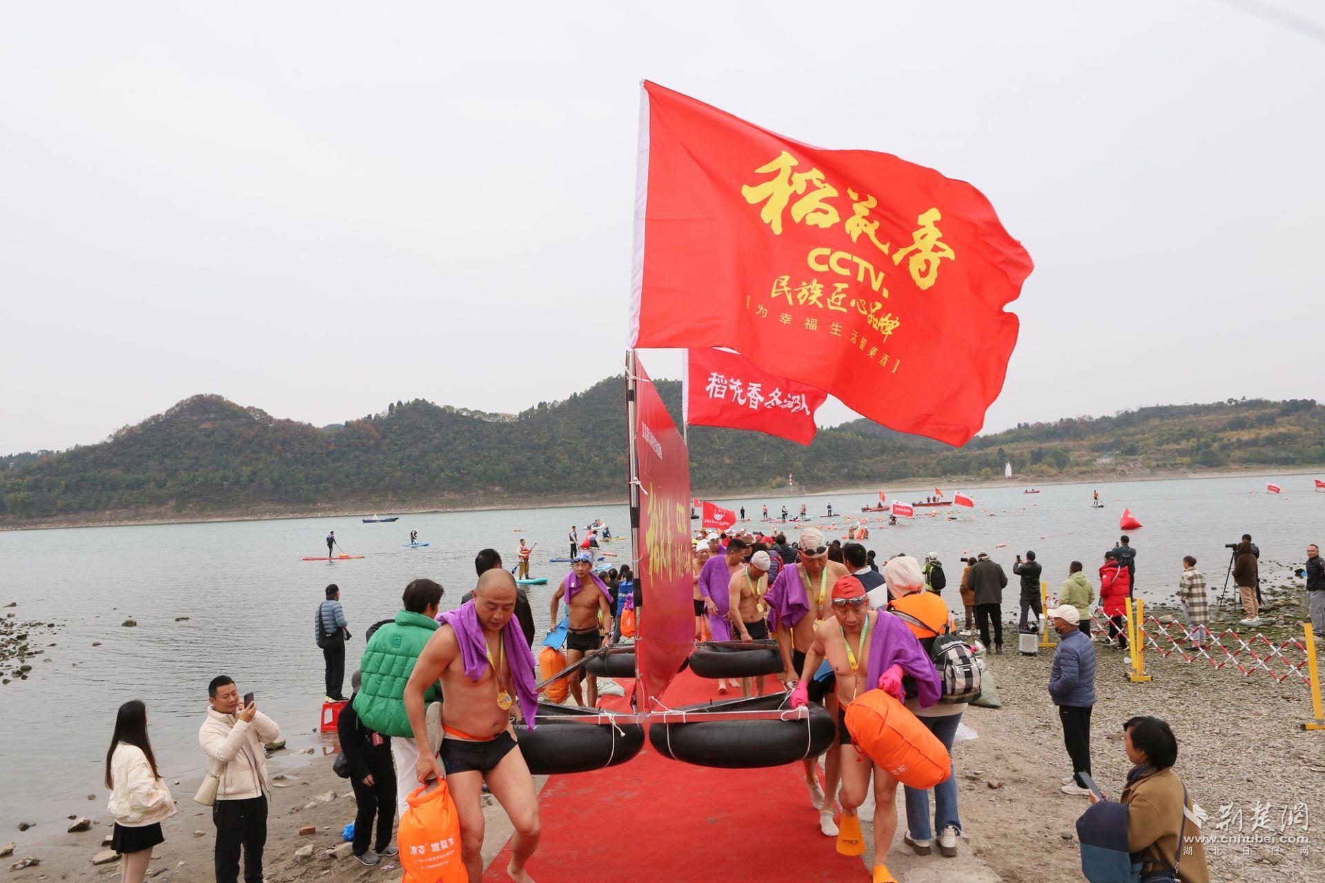 在暢游賽中,稻花香冬泳隊格外引人注目。隊員們托著巨大的“稻花香 CCTV民族匠心品牌”廣告,在江水中奮力拼搏。他們默契配合,把握行進節奏,互促互進,奔向暢游終點,憑借著出色的游泳技巧和頑強的毅力,在比賽中一路領先,最終獲得本次冬渡活動暢游賽的體育道德風尚獎。