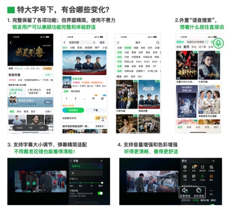 愛(ài)奇藝“特大字號(hào)”在原有三檔字號(hào)的基礎(chǔ)上,進(jìn)一步提升了字號(hào)大小,滿(mǎn)足了更多中老年人的視力需求。選擇該功能后,愛(ài)奇藝APP頁(yè)面及核心功能也將自動(dòng)應(yīng)用適老服務(wù),包括精簡(jiǎn)內(nèi)容副標(biāo)題、海報(bào)圖信息,隱藏底部導(dǎo)航圖標(biāo),增加顯著語(yǔ)音搜索按鈕等。播放頁(yè)面將自動(dòng)適配“特大”字幕和彈幕,最大支持300%音量放大,可開(kāi)啟色彩增強(qiáng)。“特大字號(hào)”功能解決了適老功能路徑較深、高齡用戶(hù)不易發(fā)現(xiàn)的問(wèn)題,真正實(shí)現(xiàn)了“一鍵適老”。