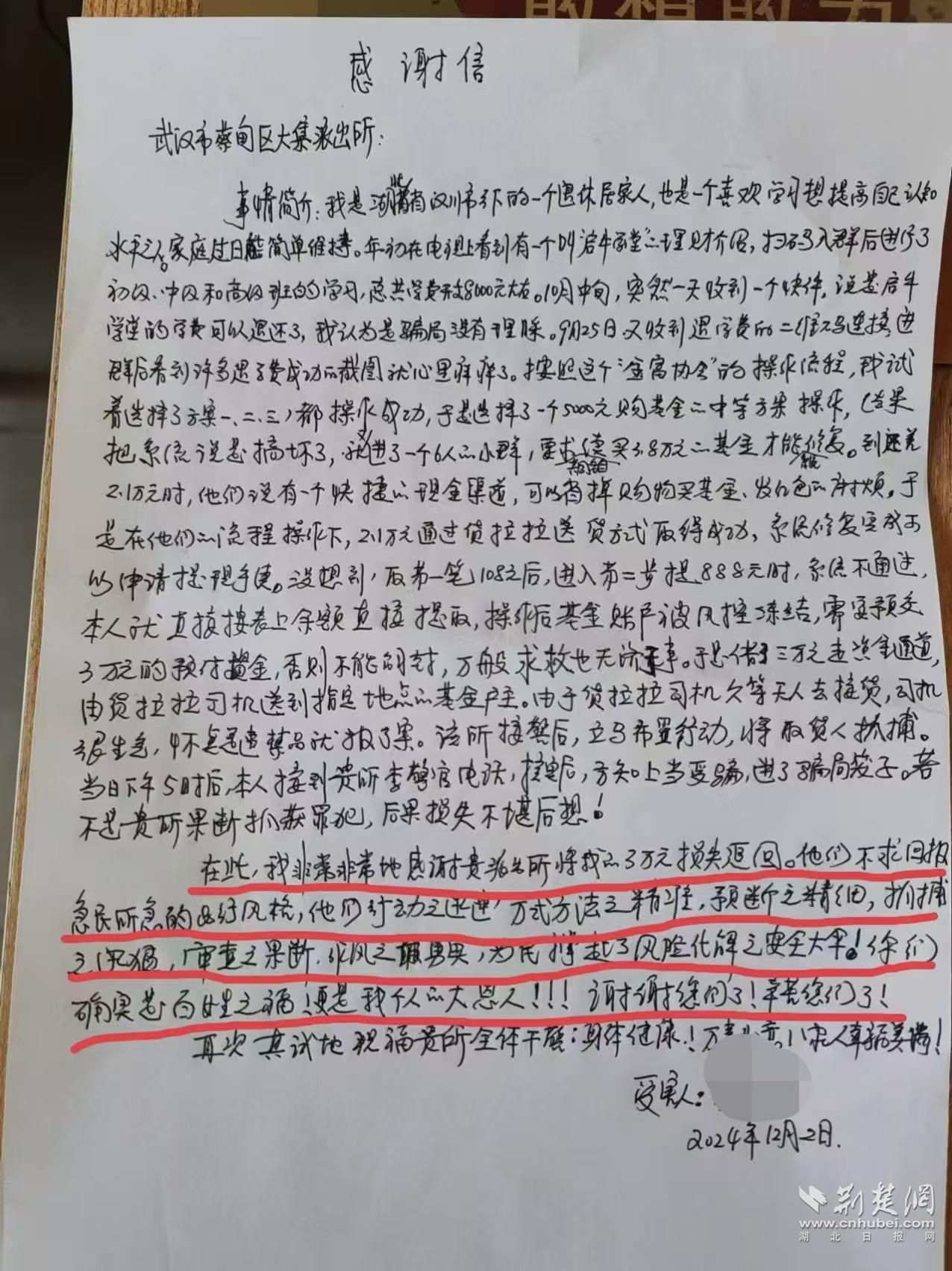 為表達(dá)感激之情,林先生接到電話當(dāng)晚就寫下一封感謝信,第二天一大早,便搭車從漢川來到大集街派出所,將感謝信交到李警官手中,原來,李警官還是個(gè)00后,為了抓住取貨的嫌疑人,李警官在取貨地點(diǎn)蹲守了近十個(gè)小時(shí),這讓林先生佩服不已。