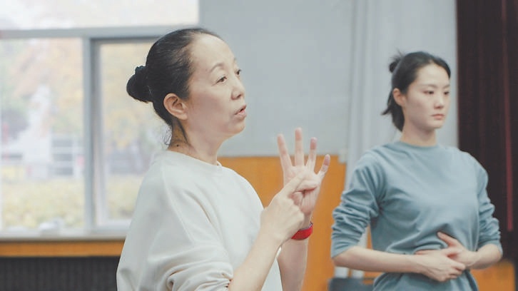 “男孩兒硬氣一點,想想戲曲演員的眼睛;女孩兒的眼神可以‘花癡’一點,柔美一點。”排練廳里,王玫正在為北京歌劇舞劇院的演員排練一段群舞,給飾演戲曲中“大靠”的男演員和飾演青衣的女演員說戲。這段群舞描繪的正是小說中恢復老戲的故事,傳統(tǒng)戲曲再次演出,老戲中英武剛正的男性和小鳥依人的女性形象躍然舞臺之上,極具傳統(tǒng)風韻。