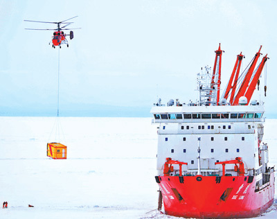 中山站位于南極普里茲灣的拉斯曼丘陵。從科考船向中山站運送物資,需要一路破冰并盡可能接近中山站,再通過雪地車或直升機卸貨。由于海冰情況復雜,“雪龍2”號短時間內無法將“雪龍”號引航至預定作業(yè)點。為保障后續(xù)任務順利推進,考察隊首次嘗試將“雪龍2”號作為“擺渡船”,并成功為“雪龍”號轉運部分重型物資到中山站附近的海冰卸貨點,再用雪地車將貨物運送至中山站。“雪龍”號上其余物資直接由直升機運送上站。
