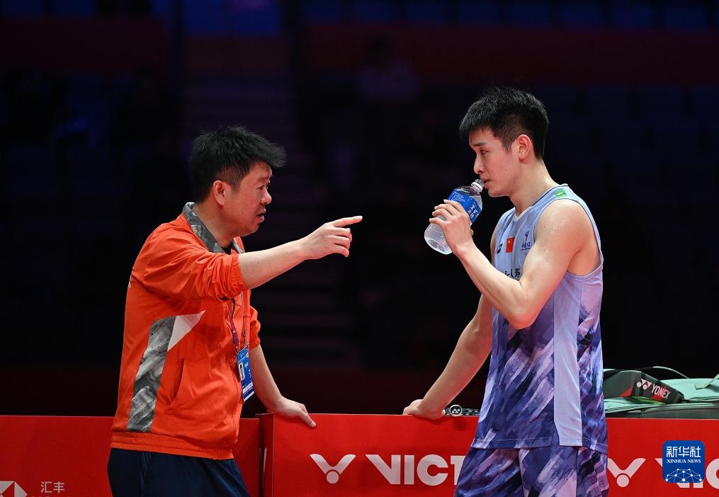 12月11日,李詩灃(右)在比賽間隙接受教練孫俊指導。