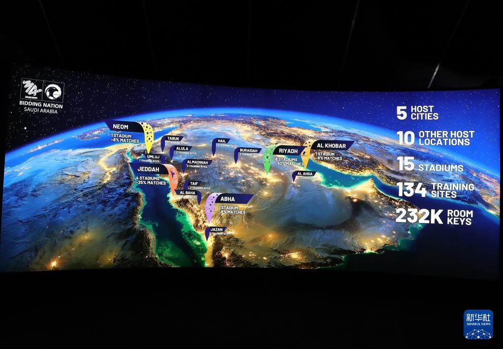 這是在沙特阿拉伯首都利雅得舉辦的2034年FIFA世界杯申辦展覽上拍攝的舉辦城市示意圖(12月11日攝)。
