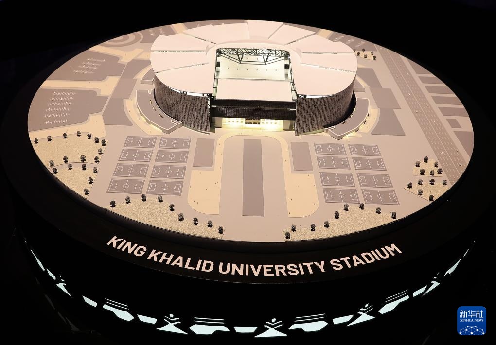 這是在沙特阿拉伯首都利雅得舉辦的2034年FIFA世界杯申辦展覽上拍攝的哈立德國王大學(xué)體育場模型(12月11日攝)。