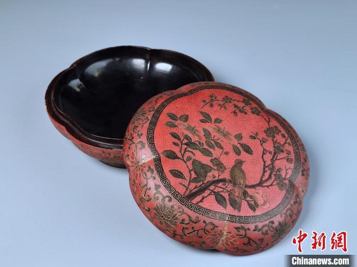 不少漆器展品備受矚目。比如,清代剔紅嵌畫琺瑯花卉紋蓋盒呈六瓣形,平頂,子母蓋,通體髹(意為“用漆涂在器物上”)紅漆。該盒蓋頂以回字紋和方勝錦地做裝飾間隔。中心一圓形開光,四周以六個扇形開光環(huán)繞,開光內(nèi)嵌飾畫琺瑯花卉圖案。盒壁以大回字紋和小回字紋做錦地裝飾。