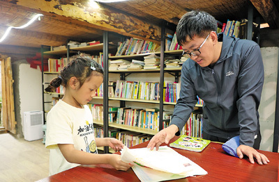 甘文勇(右)在書屋和來閱讀的孩子交流。 王靖生攝(人民視覺) |