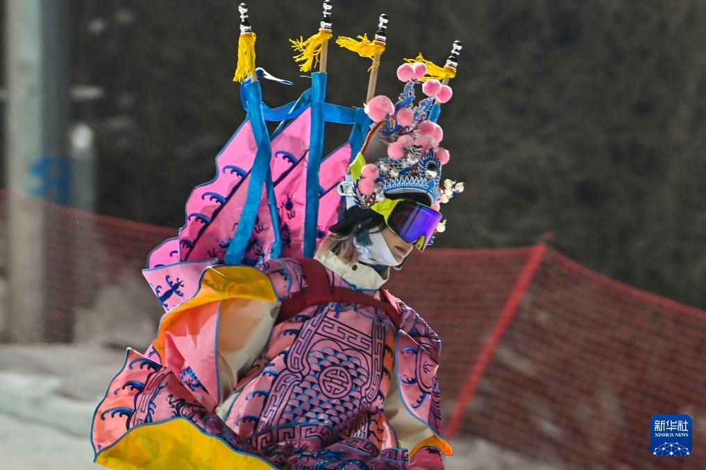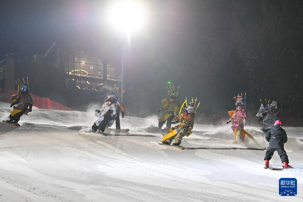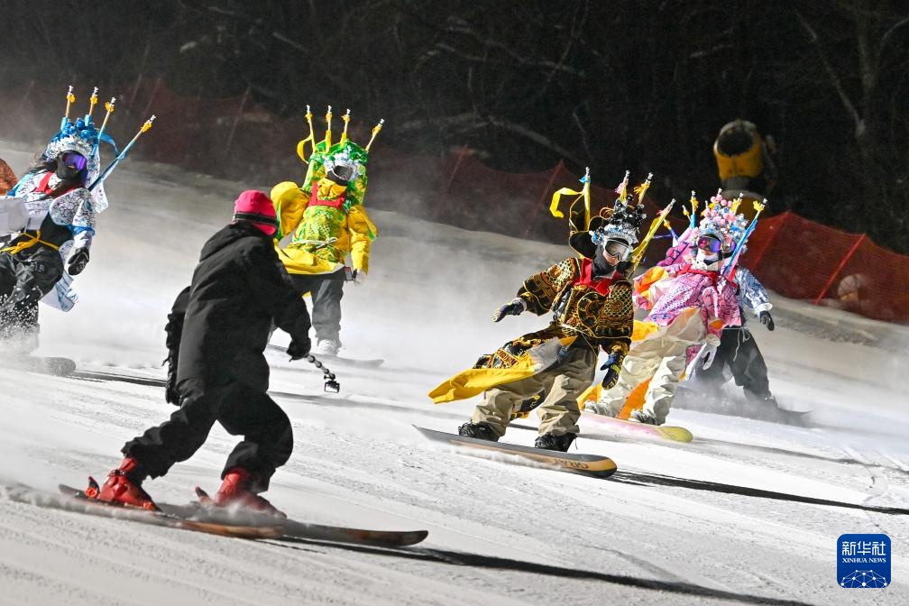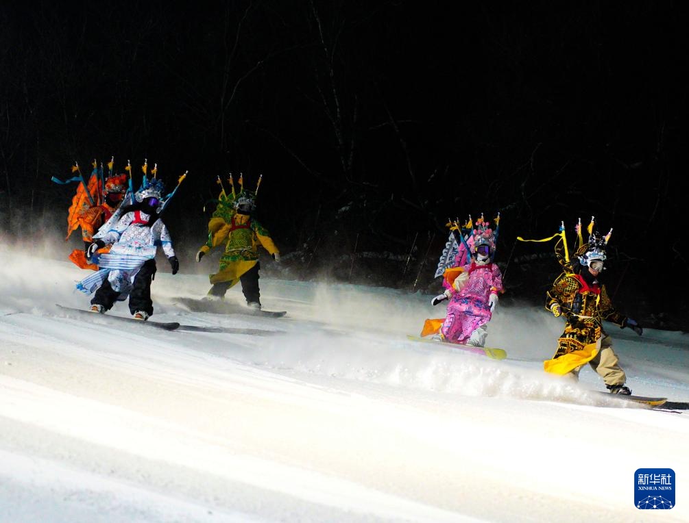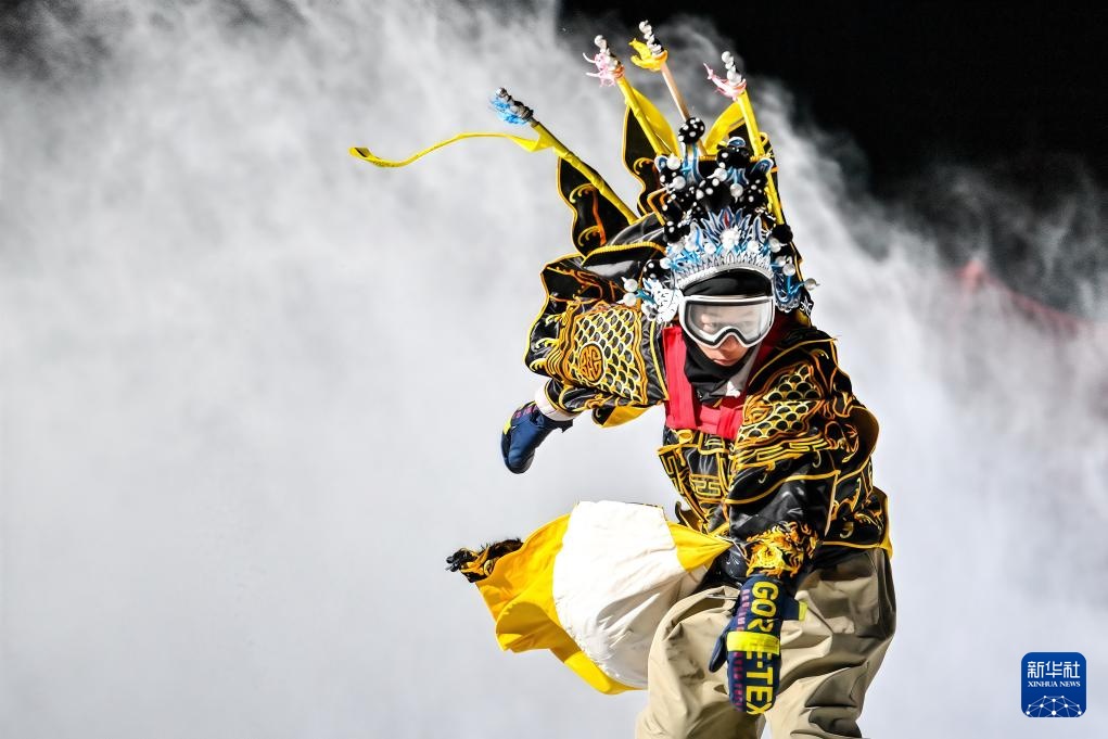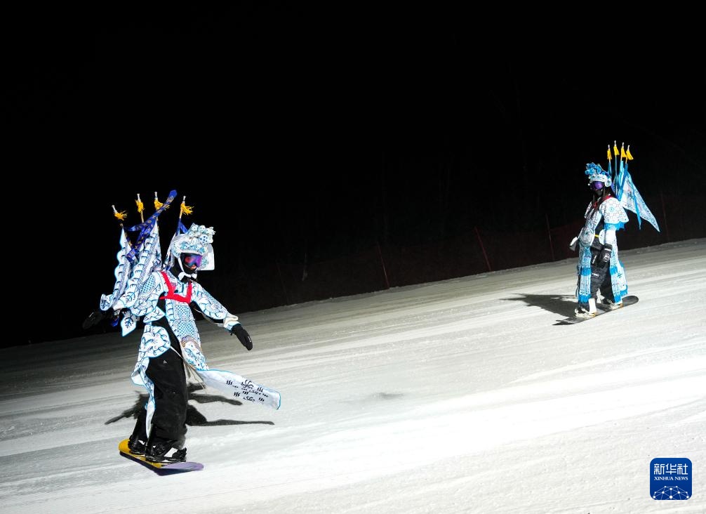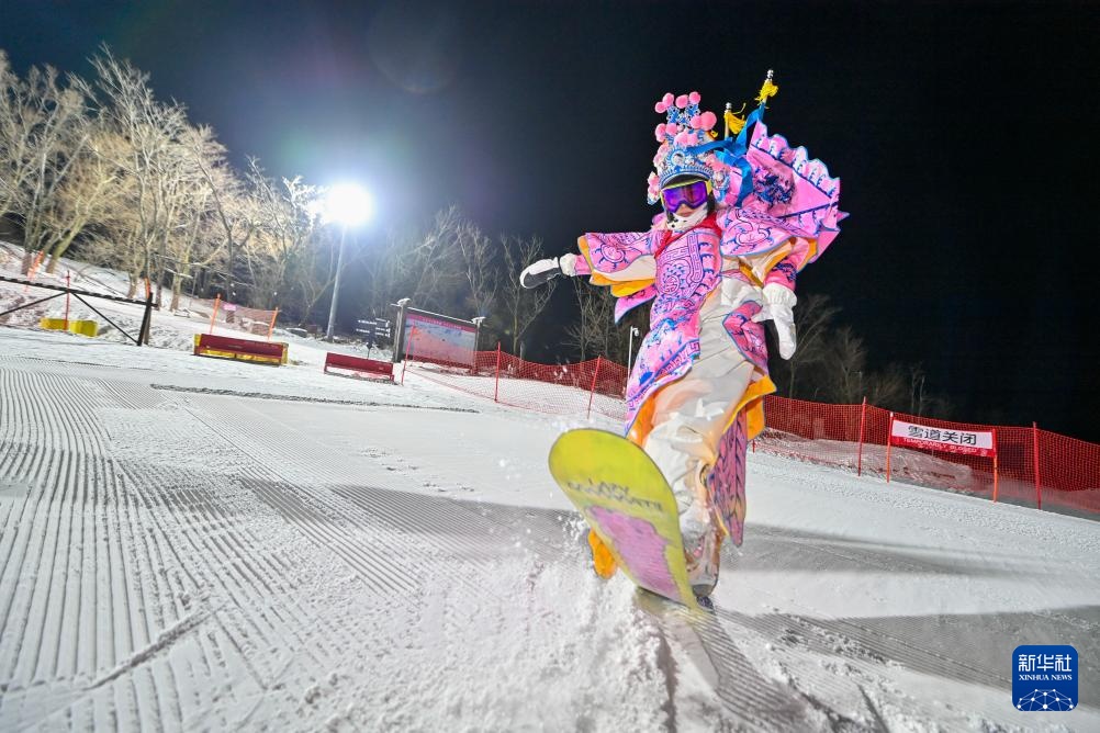 夜幕降臨,在吉林省吉林市萬科松花湖度假區的雪道上,幾位滑雪愛好者陸續走下纜車。他們腳踩單板,身著京劇服飾,經過簡單交流后縱身一躍,從雪道上飛馳而下。身后的“靠旗”與揚起的雪花一同在空中飛舞,京劇身段與單板特技的有機融合,展現出滑雪運動別樣的“國潮”之美。