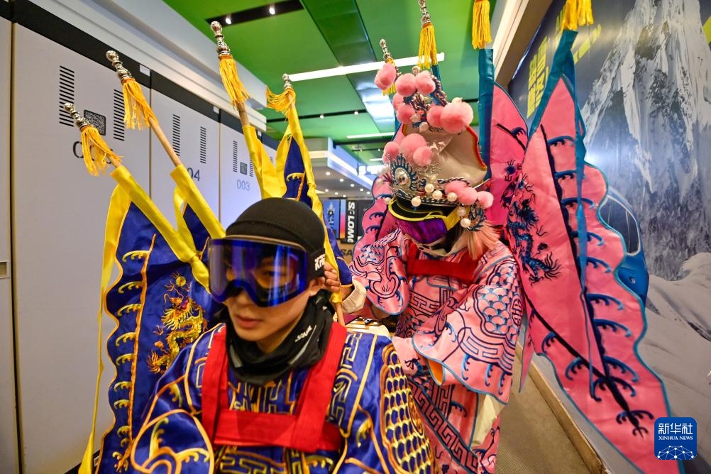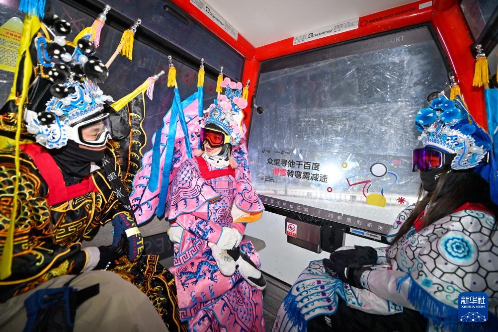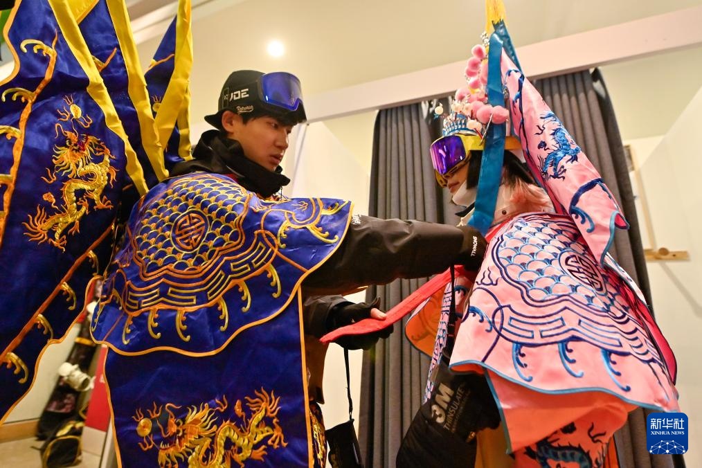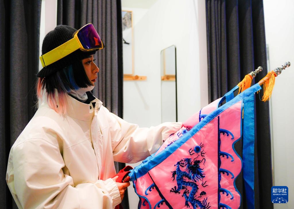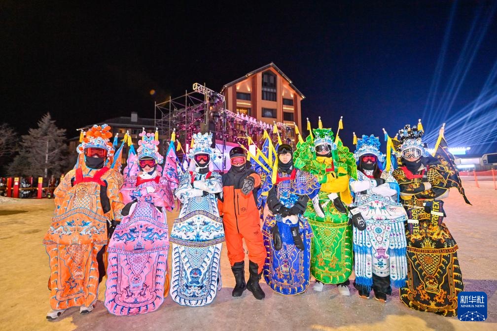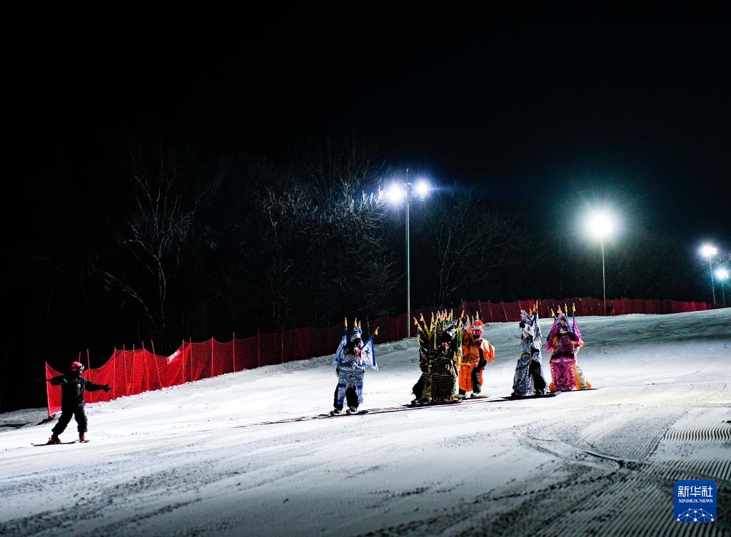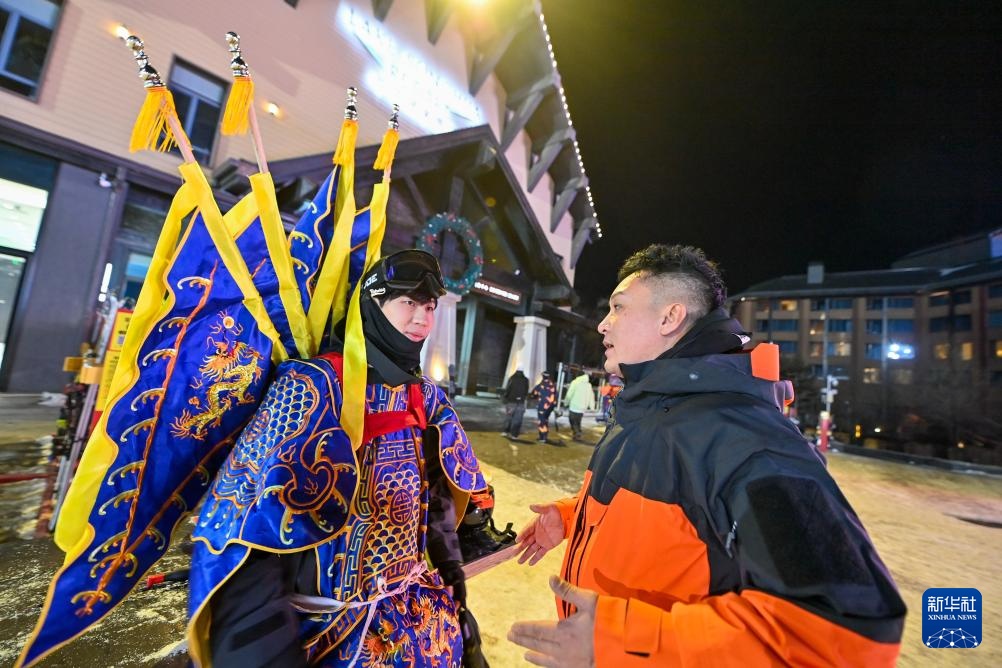 夜幕降臨,在吉林省吉林市萬科松花湖度假區的雪道上,幾位滑雪愛好者陸續走下纜車。他們腳踩單板,身著京劇服飾,經過簡單交流后縱身一躍,從雪道上飛馳而下。身后的“靠旗”與揚起的雪花一同在空中飛舞,京劇身段與單板特技的有機融合,展現出滑雪運動別樣的“國潮”之美。