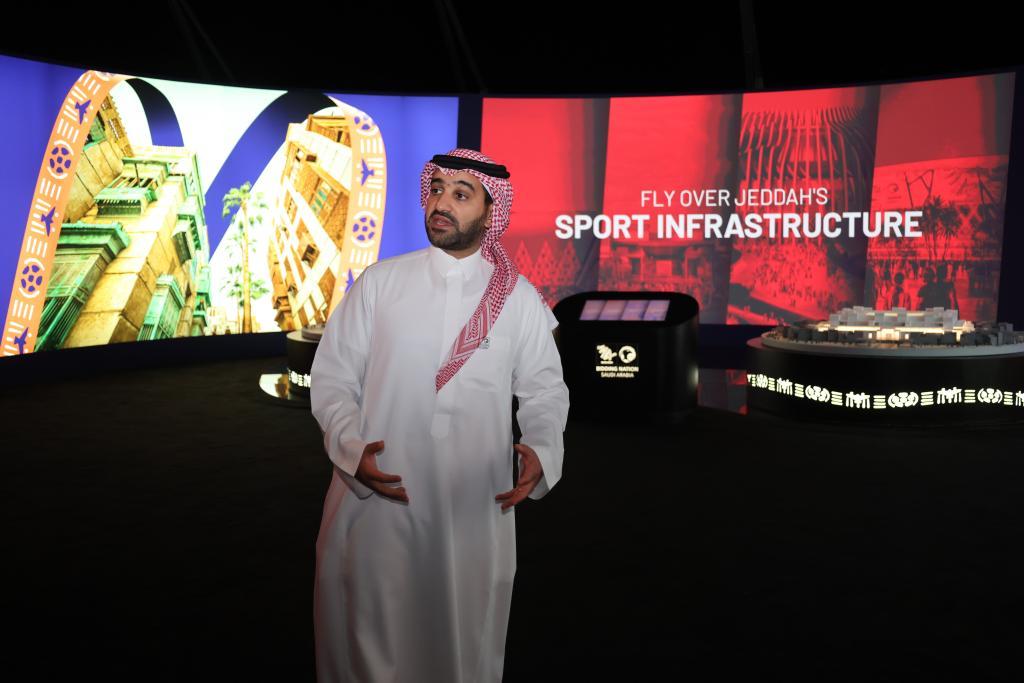 哈馬德·阿爾巴拉維在沙特阿拉伯首都利雅得舉辦的2034年FIFA世界杯申辦展覽上為媒體講解申辦理念(11月2日攝)。新華社記者 王海洲 攝