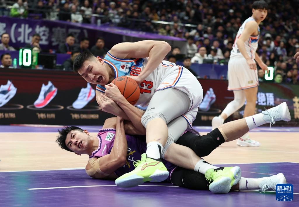 12月15日,新疆伊力特隊球員李炎哲(上)與北京控股隊球員鄒雨宸倒地拼搶。