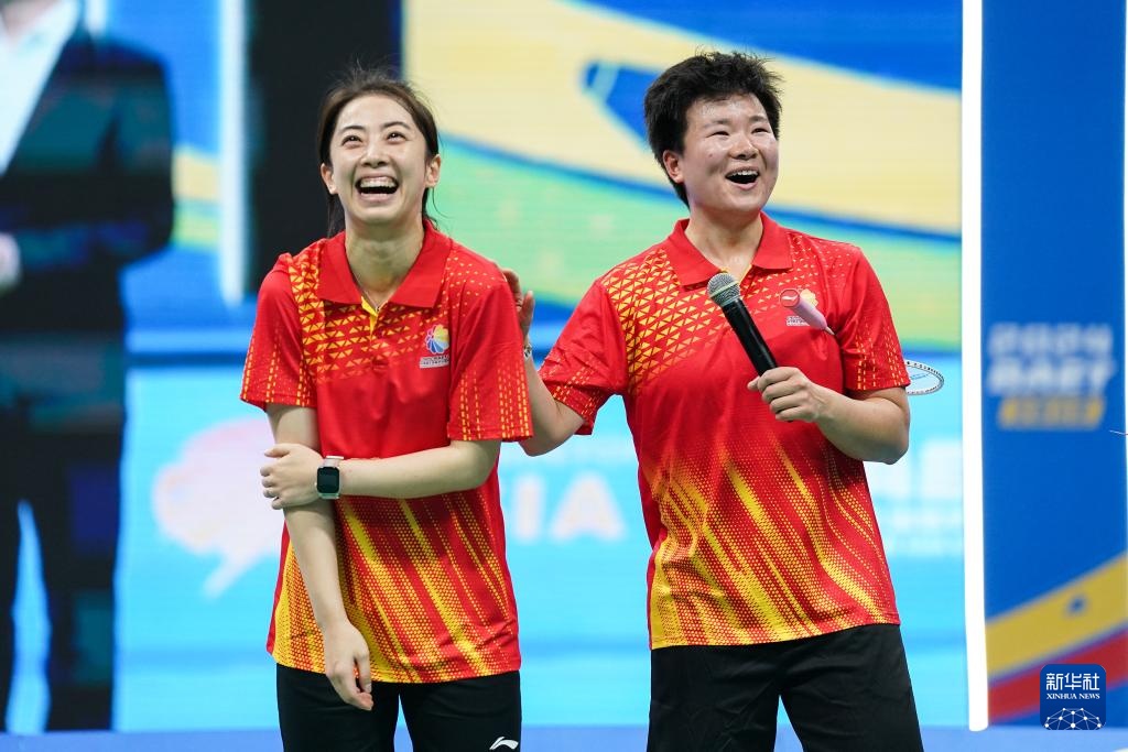 12月15日,王適嫻(左)、何冰嬌在明星挑戰(zhàn)賽后接受采訪。