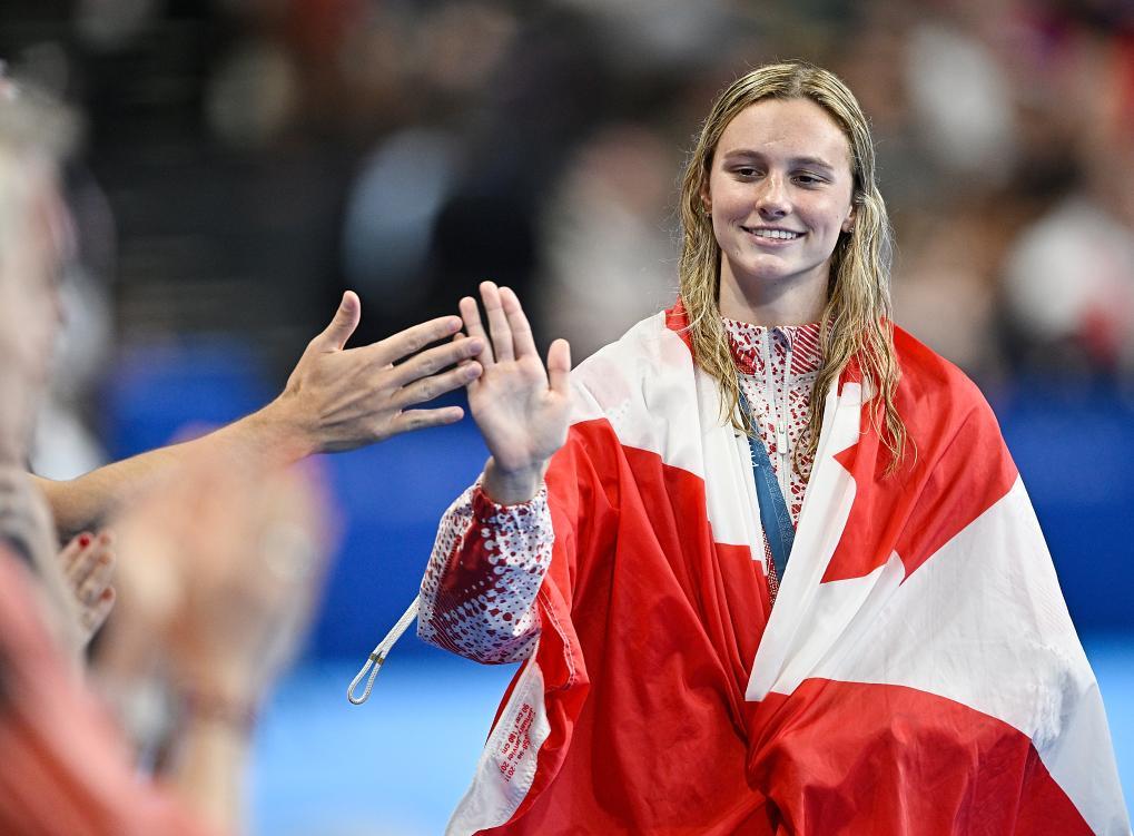 資料圖:加拿大選手麥金托什在巴黎奧運會女子200米混合泳頒獎儀式上。新華社記者 王鵬 攝