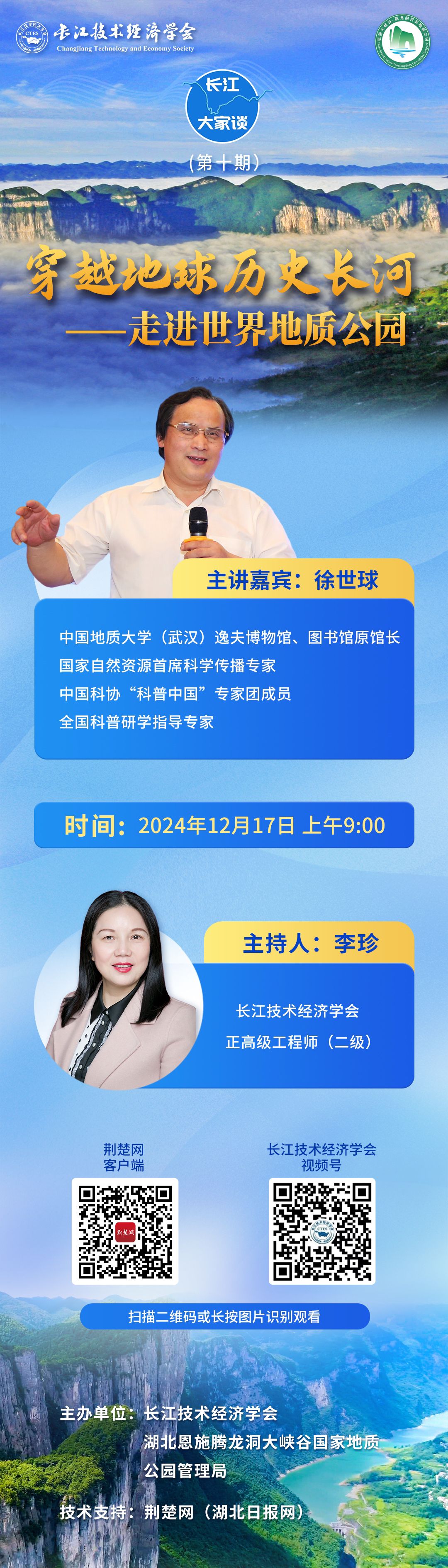 荊楚網(湖北日報網)訊(記者段晗 通訊員饒夢亭)為向社會公眾普及世界地質公園的科學知識,弘揚世界地質公園的美學和文化價值,進一步喚起社會公眾對世界地質公園的了解和關心,長江技術經濟學會依托自身的學術交流、科學普及和文化傳播平臺,聯合湖北恩施騰龍洞大峽谷國家地質公園管理局,圍繞世界地質公園主題開展“長江?大家談”云講壇(第十期)活動。特邀中國地質大學(武漢)徐世球教授于2024年12月17日開講。