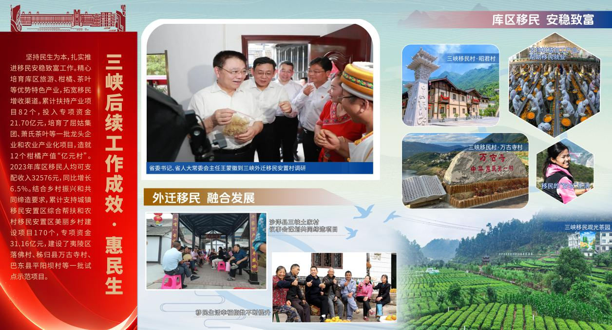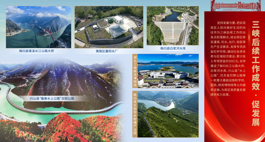 同時,展覽還重點展示了湖北省在三峽后續工作中所取得的顯著成效。湖北省水利部門深入貫徹習近平總書記關于推動長江經濟帶發展和三峽工程重要講話和指示批示精神,以“惠民生、保安全、優生態、促發展”為主線,扎實推進三峽后續工作規劃的實施。截至目前,已累計實施三峽后續項目1280個,中央已安排專項資金229.48億元,規劃實施總體進展順利,成效顯著。