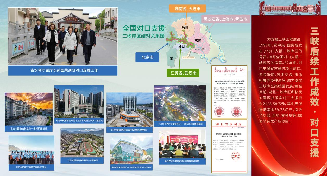 此外,展覽還特別設置了“長江中下游影響處理”和“對口支援”等板塊,對三峽后續工作在緩解長江中下游地區不利影響和三峽庫區對口支援工作的實施效果進行了深入解讀。自1992年黨中央、國務院發出對口支援三峽庫區的號召以來,全國各省市積極響應,通過項目幫扶、資金援助、技術交流等多種途徑,為湖北三峽庫區的高質量發展注入了強大動力。