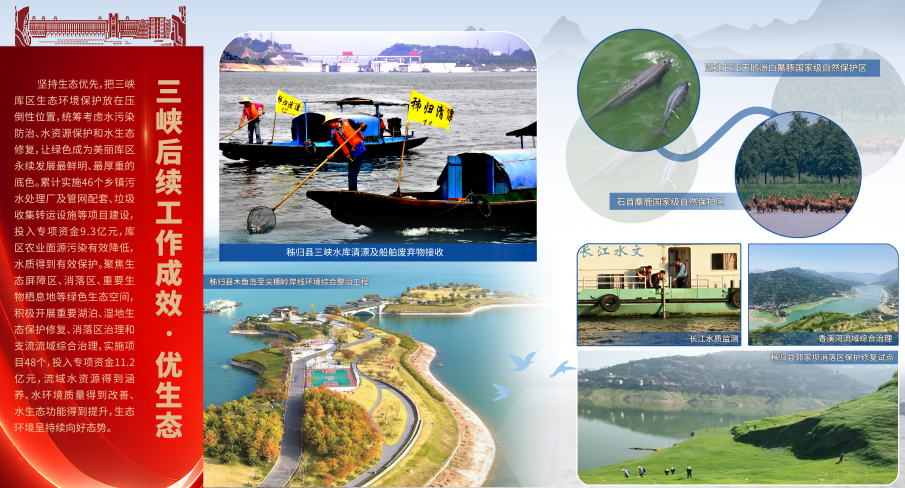 在展覽現場,一幅幅生動的圖片和詳實的數據,向觀眾展示了三峽后續工作的豐碩成果。無論是移民安穩致富、庫區經濟社會發展,還是庫區生態環境保護、地質災害防治,湖北省都取得了令人矚目的成績。特別是通過實施一系列生態修復項目,三峽庫區的生態環境得到了顯著改善,水質得到有效保護,流域水資源得到涵養,水生態功能得到提升。