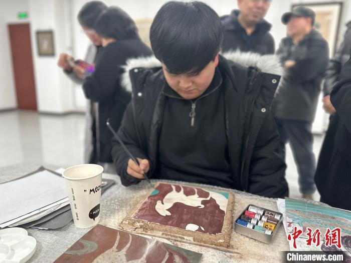 圖為青年畫師現場繪制巖彩畫。楊娜 攝