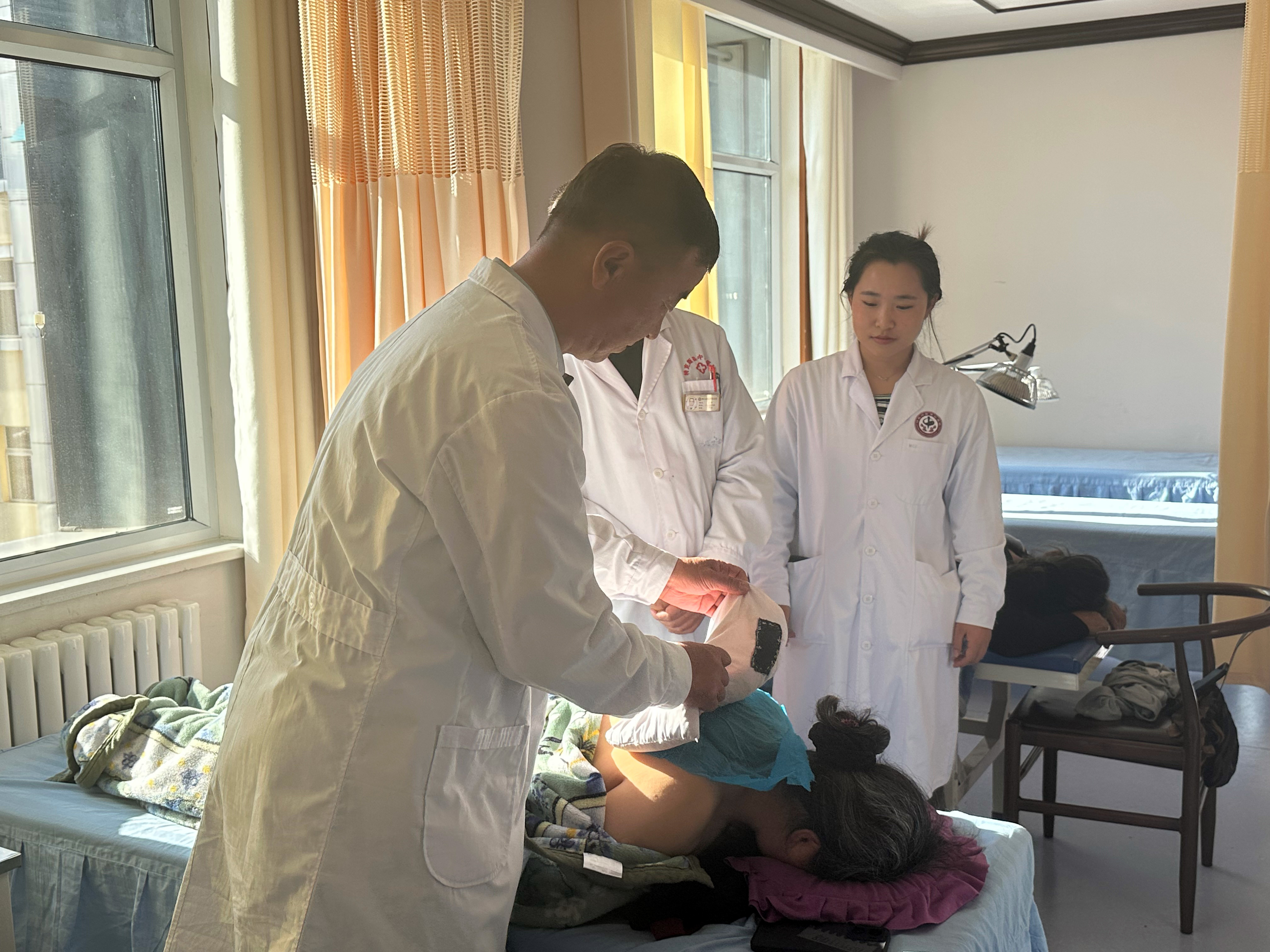 居馬泰·俄白克(左一)給患者進行中醫灸治療。人民網記者 楊睿攝