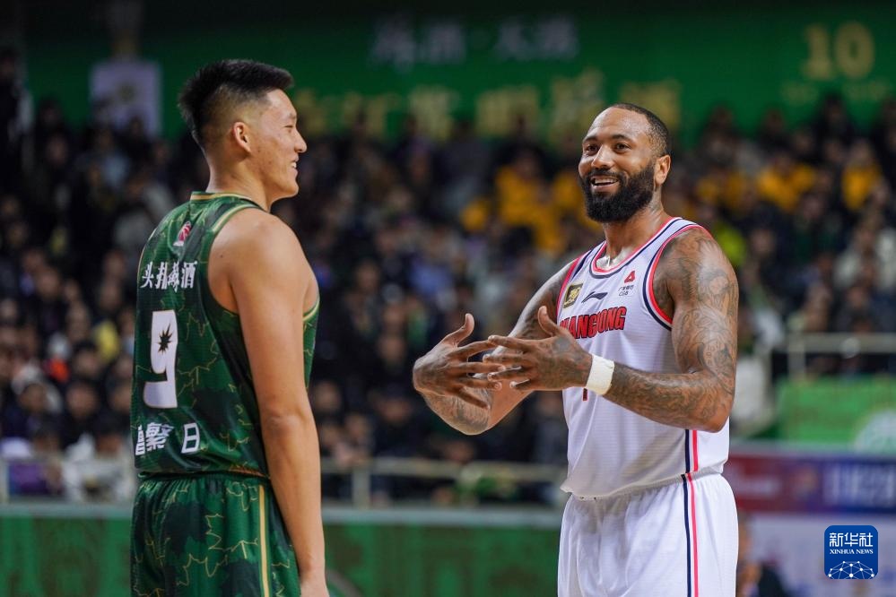 12月18日,廣東東陽光隊球員吉倫沃特(右)與南京頭排蘇酒隊球員曾繁日在比賽中。新華社記者 李博 攝