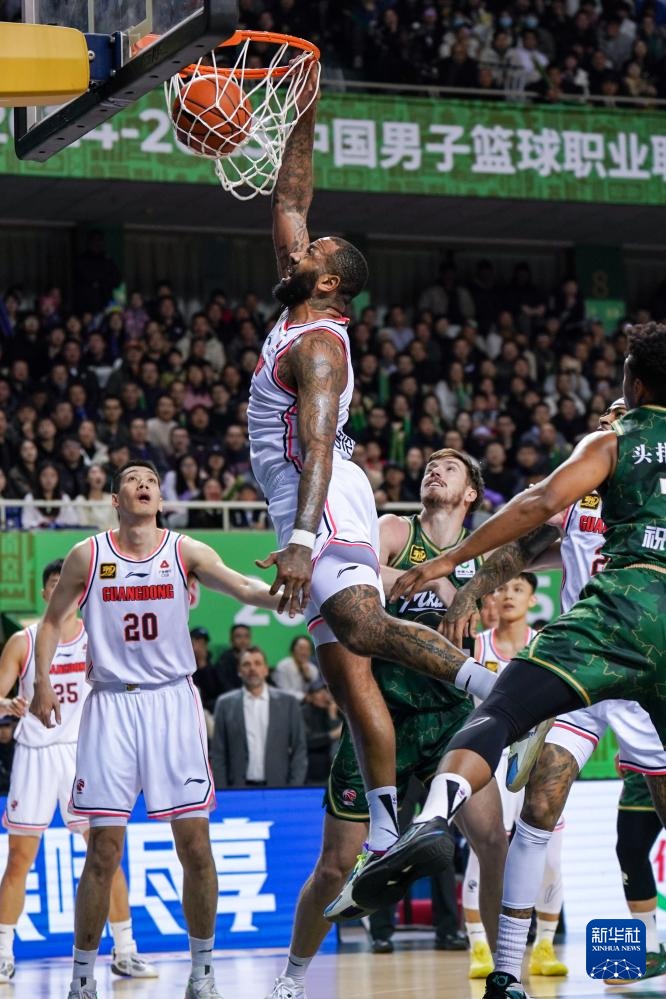 12月18日,廣東東陽光隊球員吉倫沃特(上)在比賽中扣籃。新華社記者 李博 攝