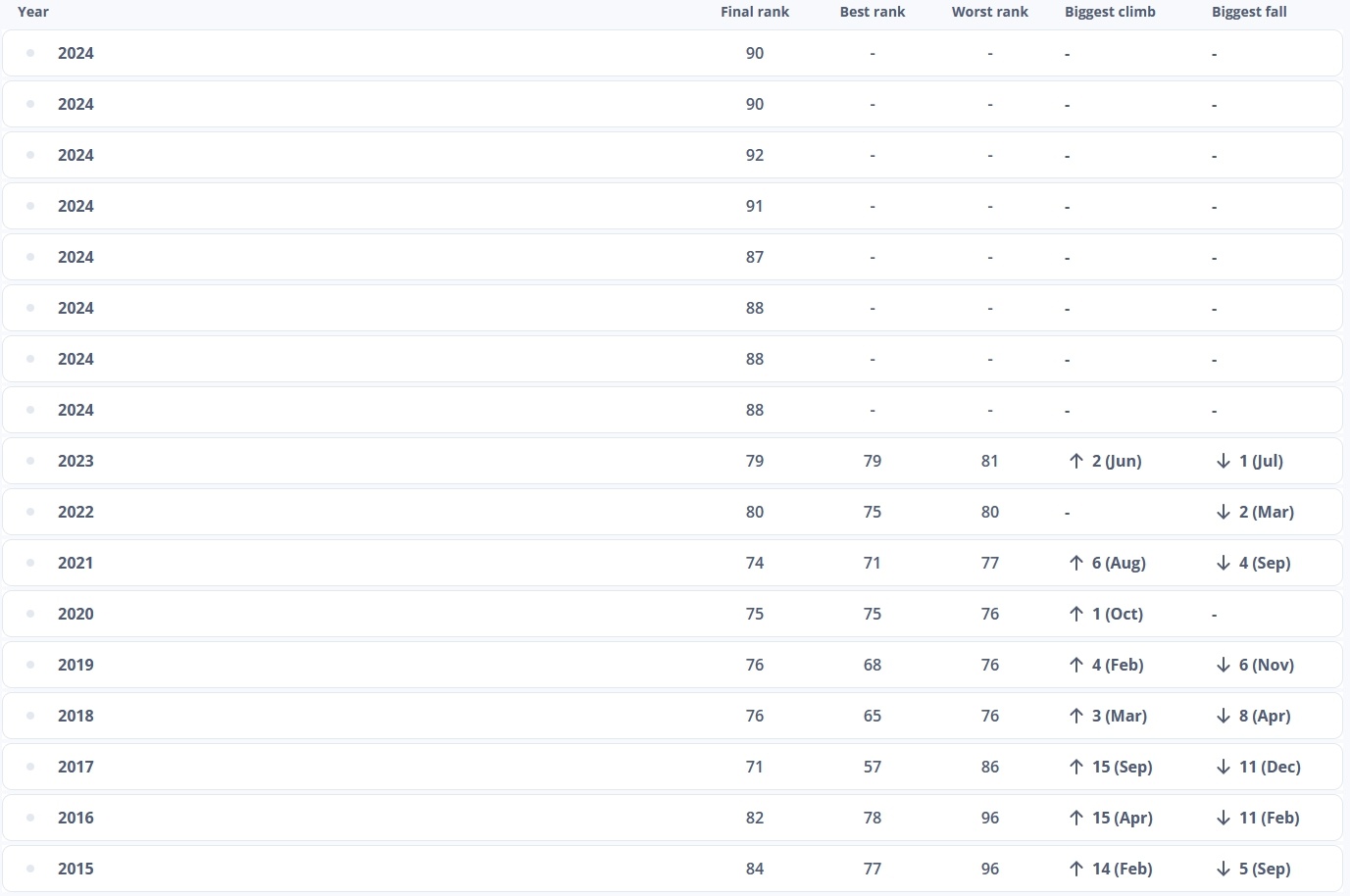在11月的榜單中,國足升至第90位。但這仍是球隊在過去十年間(2015-2024)最低的年終排名。