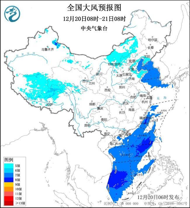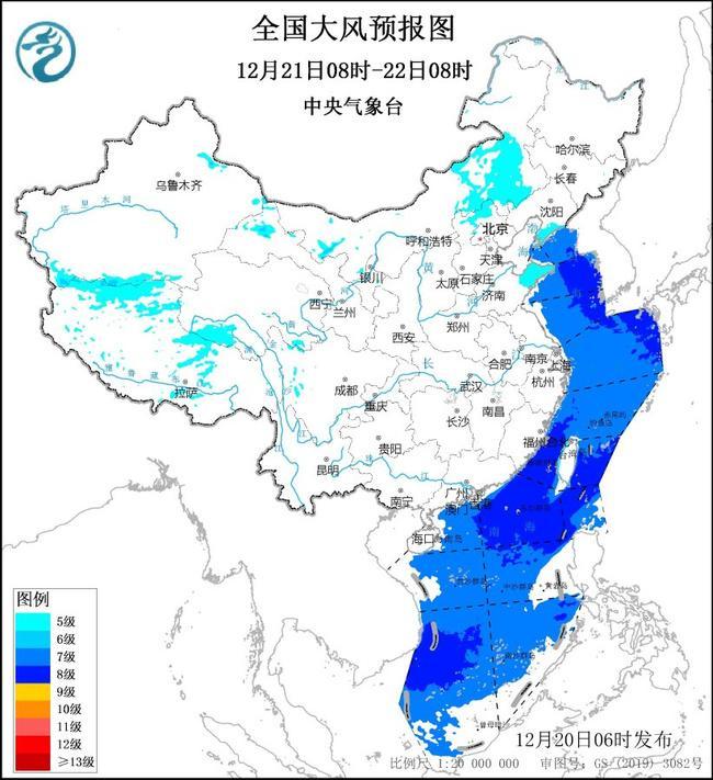 預計,12月20日08時至21日08時,西藏中北部、青海南部、甘肅西部、內蒙古中部、遼東半島、河北沿海地區、天津沿海地區、山東半島等地部分地區將有5~6級、陣風7~8級的大風;渤海、渤海海峽、黃海大部海域、東海南部海域、臺灣海峽、臺灣以東洋面、南海大部海域將有7~8級、陣風9級的大風。