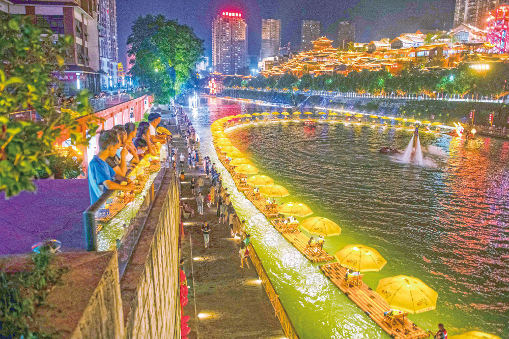 2023年8月18日,游客在貢水河邊欣賞夜景。