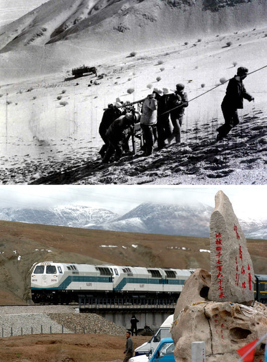 拼版照片:上圖為20世紀50年代拍攝的勘測青藏線的資料照片;下圖為2006年7月1日,青藏鐵路全線通車。這是從格爾木出發的“青1”次列車經過海拔4767米的昆侖山口。(新華社記者侯德強攝)