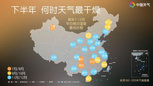 中國天氣網統計1991至2020年氣候數據發現,常年下半年,全國有超過一半的大城市平均相對濕度最低時期出現在11至12月,包括西寧、銀川、西安、太原、北京、濟南、鄭州、沈陽、南京、杭州、武漢、成都、昆明、南寧、廣州、拉薩共16個省會首府直轄市。中國天氣網氣象分析師沈雨旸表示,常年此時,暖濕氣流減弱,降水量整體減少,且常有冷空氣南下,形成干冷氣團控場的局面,會導致空氣比較干燥。
