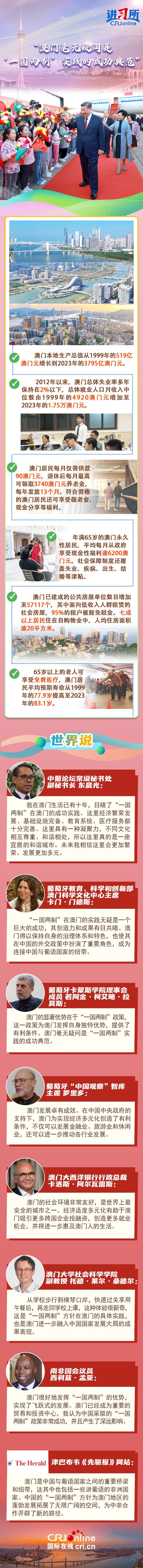 25年來,在中國中央政府大力支持下,澳門與120多個國家和地區建立了穩定的經貿文化關系,參加國際組織和機構的數量增至190多個,已獲得147個國家和地區免簽或落地簽待遇,全球“朋友圈”越來越大……正如習主席11月在北京會見澳門特別行政區候任行政長官岑浩輝時所強調的,“‘一國兩制’是符合國家、民族根本利益,符合澳門根本利益的好制度。”多位在澳門長期生活的外籍人士也認為,澳門毫無疑問是“一國兩制”實踐的成功典范,未來這里會更加繁榮、發展更加多元。