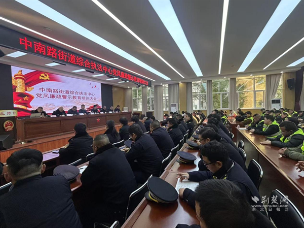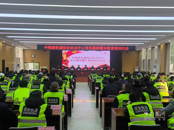 荊楚網(湖北日報網)訊(通訊員 杜宇 陳思宇)為強化黨風廉政建設,落實反腐工作主體責任,12月18日下午,武昌區中南路街道綜合執法中心召開黨風廉政建設警示教育大會。街道公管辦工作人員、執法中心隊員及協管員、環衛所工作人員共計200余人參加會議。
