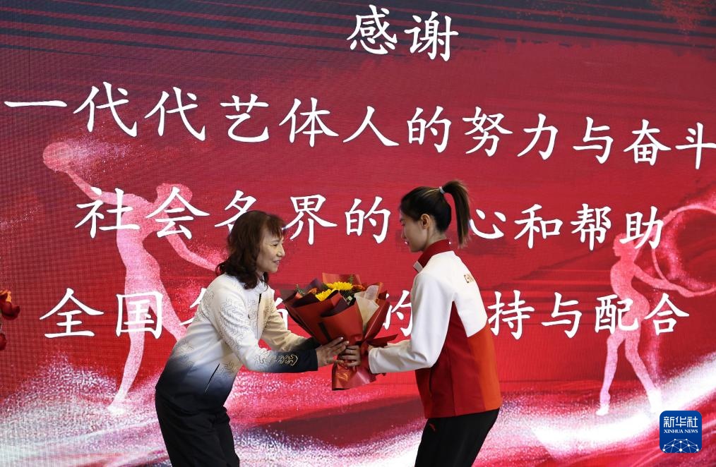 12月20日,中國藝術體操隊隊員郭崎琪(右)在登榜儀式上向代表藝術體操老前輩致辭的張慧琴獻花。新華社記者 賈浩成 攝