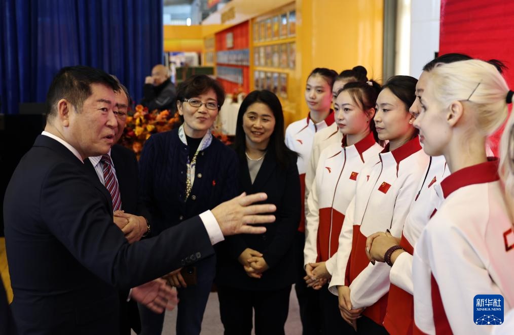 12月20日,獲得巴黎奧運會藝術體操項目集體全能金牌的中國藝術體操隊成員們與國際體操聯合會主席渡邊守成(左一)在登榜儀式后交流。新華社記者 賈浩成 攝