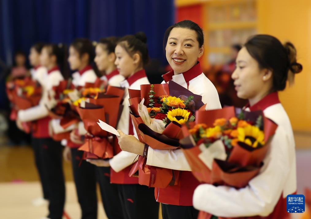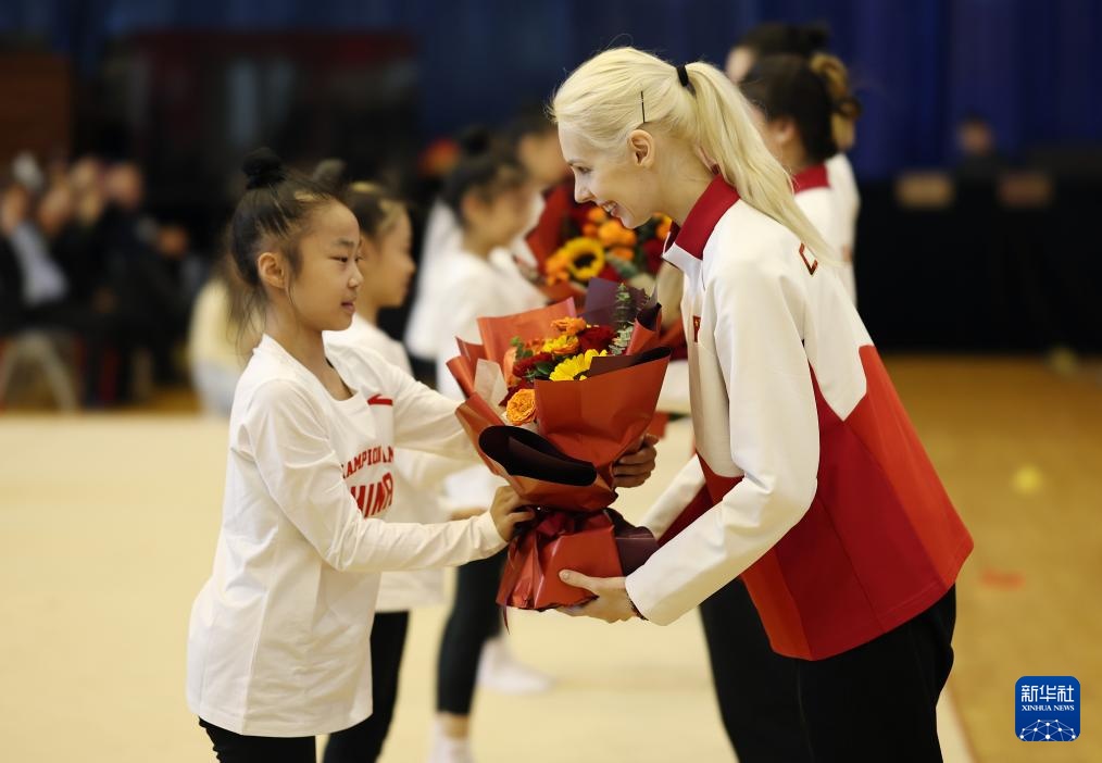 12月20日,中國藝術體操隊小隊員在登榜儀式上向教練阿納斯塔西婭·布利茲紐克獻花。新華社記者 賈浩成 攝