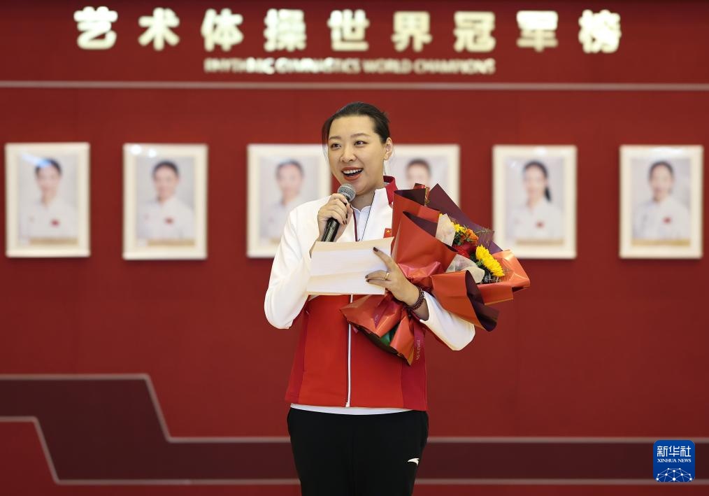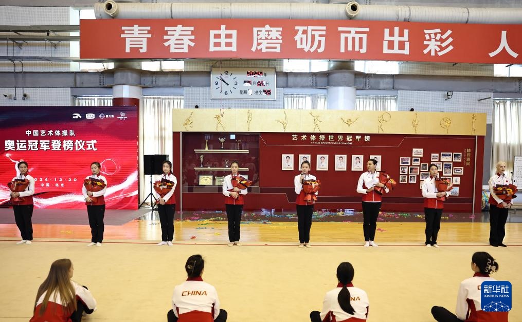 12月20日,獲得巴黎奧運會藝術體操項目集體全能金牌的中國藝術體操隊成員們在登榜儀式上發言。新華社記者 賈浩成 攝