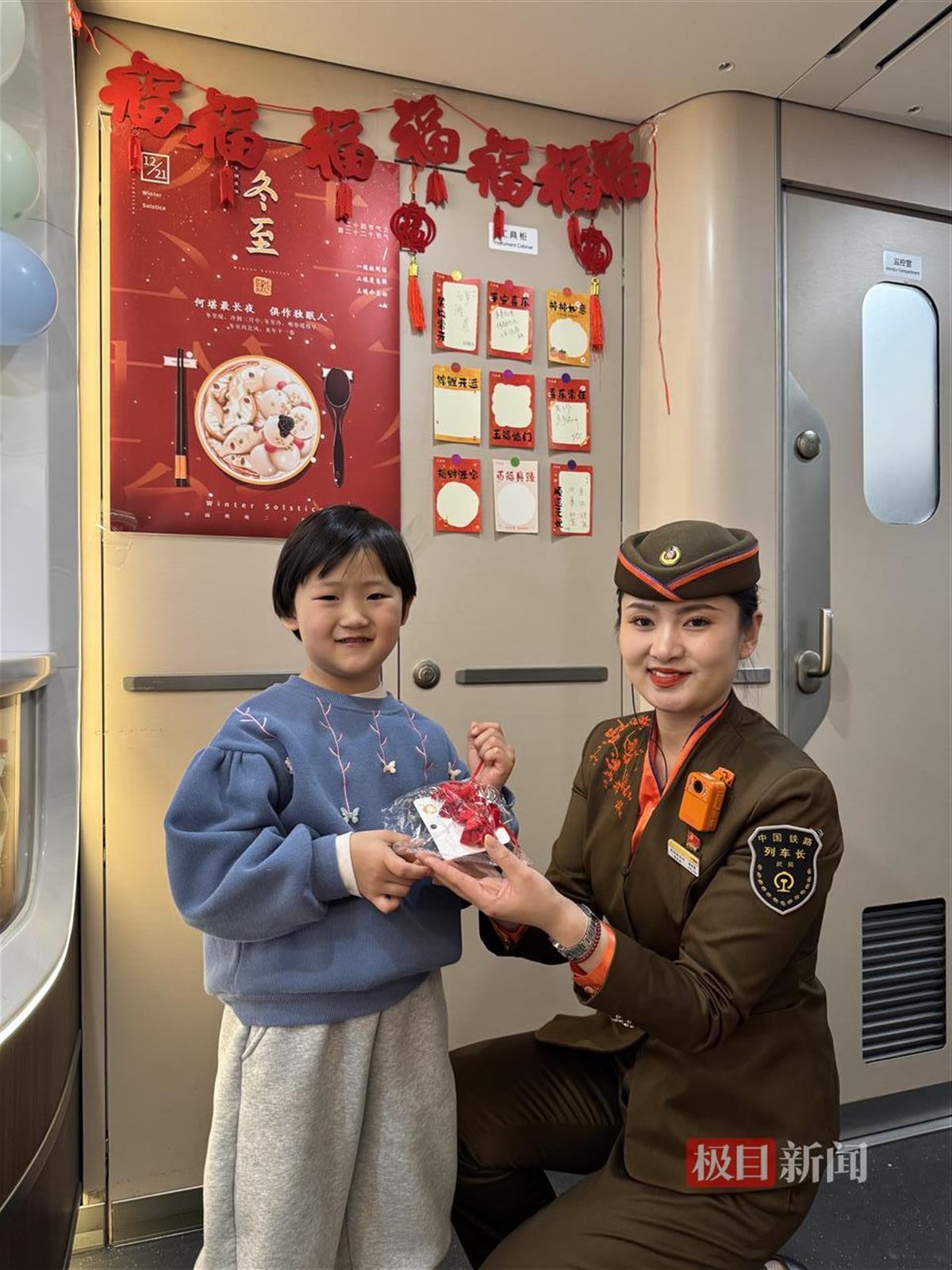 乘務員潘冬雪在派送湯圓的同時,還與旅客們積極互動,分享冬至的文化典故與傳統(tǒng)習俗。小朋友們興致勃勃地參與冬至主題成語接龍游戲,車廂內(nèi)歡聲笑語,其樂融融。