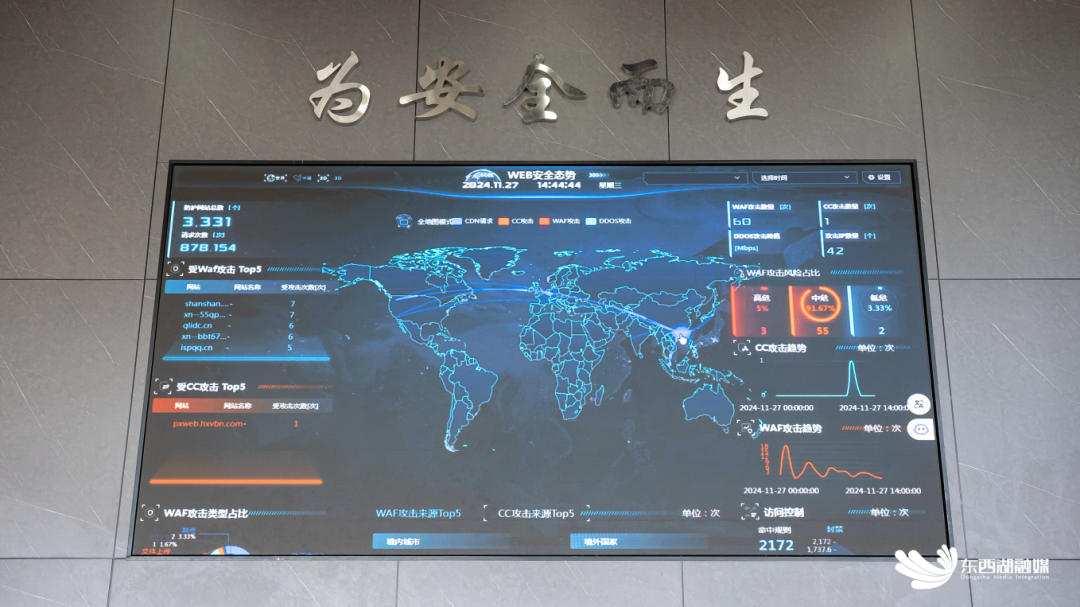 走進中云科技一樓大廳,近100寸的用戶全球攻擊態(tài)勢圖高懸在墻上,屏幕實時更新著用戶被攻擊的次數(shù)、來源、種類等信息。一旁的展廳中,密盾、DDOS防火墻、下一代防火墻、堡壘機、內(nèi)容監(jiān)控系統(tǒng)、云安全、主機安全等產(chǎn)品依次排列,豐富的種類令人目不暇接。