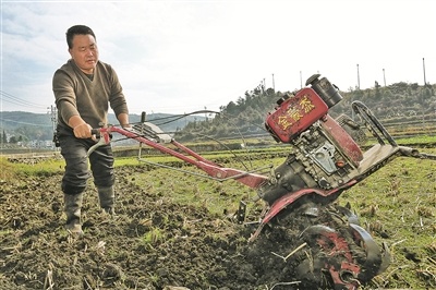 在花溪區(qū)高坡鄉(xiāng)五寨村蘇亞組的高標準農(nóng)田里,蘇亞組村民王家坪正在使用小型旋耕機耕地,準備種冬油菜?!耙郧坝门;蛴娩z頭耕地,費勁得多。”王家坪說:“今年機耕道修好了,農(nóng)機下地很方便,我一個人一天就能耕兩三畝,比以前人力快十多倍。”
