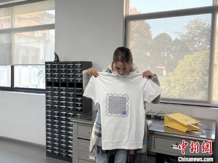 12月16日,哈薩克斯坦姑娘薩沙正在欣賞自己設計的T恤。中新社記者 李韻涵 攝