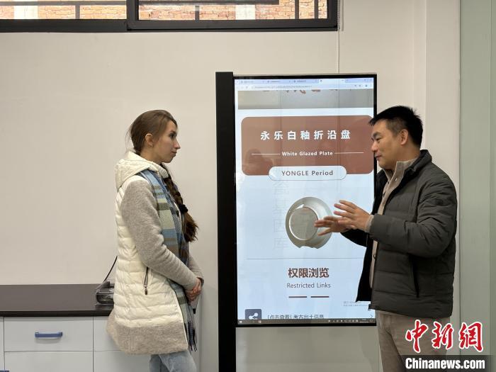 12月16日,哈薩克斯坦姑娘薩沙正在景德鎮古陶瓷基因庫了解古瓷片的故事。中新社記者 李韻涵 攝