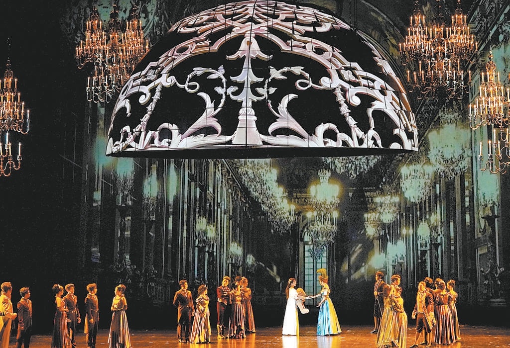 與壯闊宏大的作品立意相匹配的,是當得起華美二字的舞臺呈現。璀璨的吊燈、長長的樓梯等鮮明意象不斷出現,簡潔的布景與流動的影像虛實交織,把輝煌的宮廷、幽靜的鄉村、無垠的星空等場景營造得深邃動人。其中,由多塊LED屏拼成的圓弧最引人注目,在舞美設計維亞切斯拉夫·奧庫涅夫的解讀中,和平的寧靜短暫降臨時,圓弧可以隨影像變幻為宮殿穹頂、簡潔的花園涼亭,為生活遮風擋雨;戰爭襲來,刺目的紅光從破裂崩碎的圓弧中迸濺而出,恰如滿目瘡痍、生靈涂炭的現實。最終,幾瓣圓弧拼成碧水青山的“地球”,呼應原著小說標題中的俄語單詞“Mip”,即“世界”,將作品的意境再次推上新的高點。