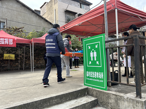 演練伊始,接收到險情報告后,社區災害應急指揮部迅速行動。后勤保障組在災害發生敲鑼鳴響警示,拉警戒線。應急搶險組組織危險區40余名群眾按預定路線轉移撤離到安全區。應急搶險隊員則利用滅火器撲滅煤氣泄漏引發的火情。醫療衛生組搜救和轉移地質災害點的傷員,各項應急工作有序推進。
