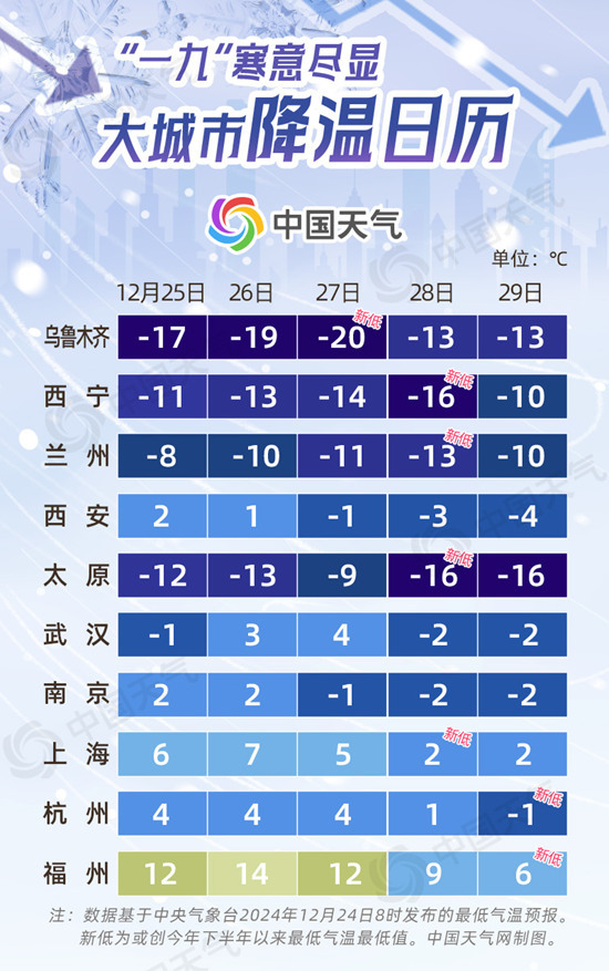 中國(guó)天氣網(wǎng)訊 數(shù)九寒天,我國(guó)大部進(jìn)入隆冬時(shí)節(jié)。都說(shuō)“一九”“二九”不出手,今年“一九”我國(guó)大部也是在寒冷中開場(chǎng)。明天(12月25日)至27日,又將有較強(qiáng)冷空氣影響我國(guó),“一九”寒意盡顯。中國(guó)天氣網(wǎng)推出大城市降溫日歷,看哪些城市將創(chuàng)今年下半年來(lái)氣溫新低。