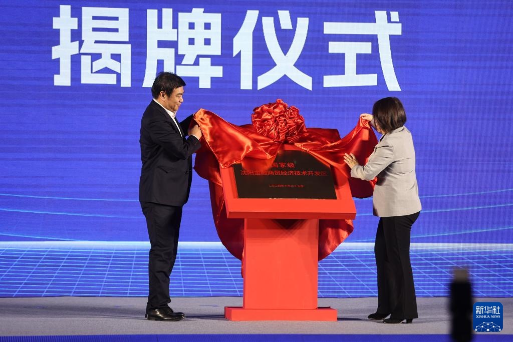 大會(huì)現(xiàn)場(chǎng)為“沈陽金融商貿(mào)經(jīng)濟(jì)技術(shù)開發(fā)區(qū)”舉行揭牌儀式。新華社記者 潘昱龍 攝